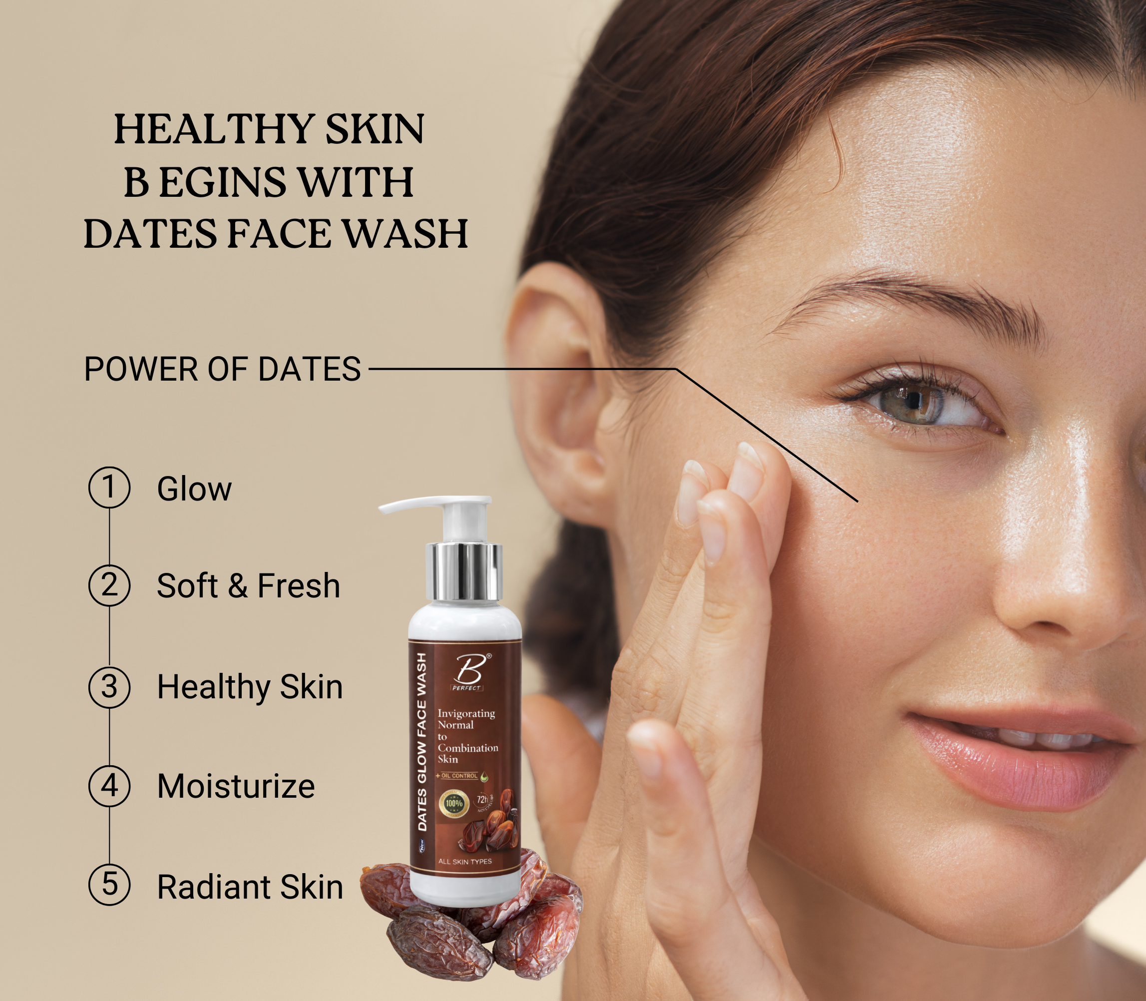 Dates Glow Face Wash is a natural facial cleanser infused with the nourishing properties of date fruit extract to gently cleanse, hydrate, and brighten the skin.